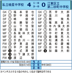 4対0で江東区立第二砂町中学校(以下二砂)を下した私立暁星中学校(以下暁星)の荒木弘監督は決勝をこう振り返る。「正直、点差ほどの開きはなかった。やられてもおかしくないという場面は何度もあった。それでも持ち応えられたのは、後ろ(DF)3枚の安定が大きい。ウチはこの1年間、崩されて失点してないんです」 反対に敗れた二砂の金子哲郎監督はサバサバとした表情で言う。「押し込んでいたときに決められなかったのが全て。最後の3失点はCBを1枚上げて、攻めに出た結果だから仕方ない」 試合は前半12分(30分ハーフ)、暁星の岩崎秀がFW平戸奨眞からのパスを右サイド前方で受けると、GKのポジショニングを良く見てループシュート。これが鮮やかに決まり、暁星が先制点を奪った。 だが、7月24日から(25、28日を除く)続く連戦の疲れがここに来て出たのだろう。20分過ぎからパタッと暁星の足が止まり、その後は「技術的には都内でもトップレベルだと思う」(金子監督)という二砂が、ショートパスをつないでゲームを優位に展開。暁星の山下恒聖キャプテンも「1点取ってからの流れが悪くて、正直焦ってた」というように、苦しい時間帯が続く。 それでも55分、残り10分から同点に追いつくために二砂がCBの秋月利彦をMFに上げ、ディフェンスが手薄になったところを突いて、カウンターから百合川一成が値千金の追加点を決める。これで二砂の集中が切れたのか、ロスタイムの60分、61分にも立て続けにゴールが飛び出し、終わってみれば4点という大差で勝利。この結果、暁星の優勝は7年ぶり10度目となり、最多記録を更新した。 なお、両校は関東大会も見事に勝ち抜き、関東代表として8月19日より愛媛県を中心に行なわれる全国大会に出場。暁星、二砂共に1回戦を突破しベスト16という結果を残した。